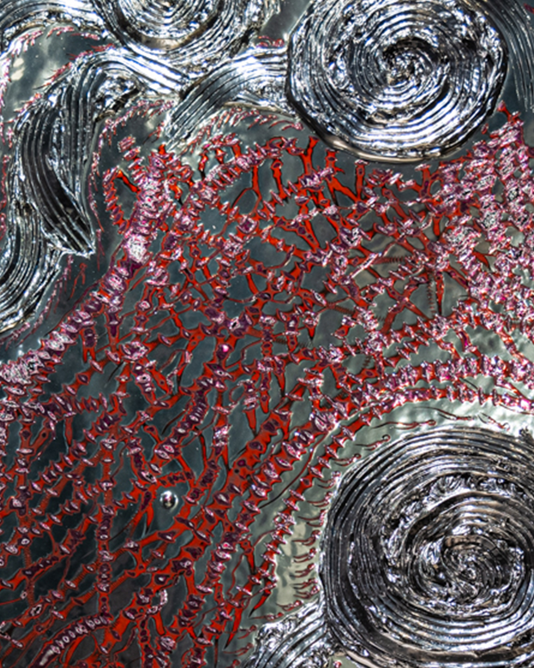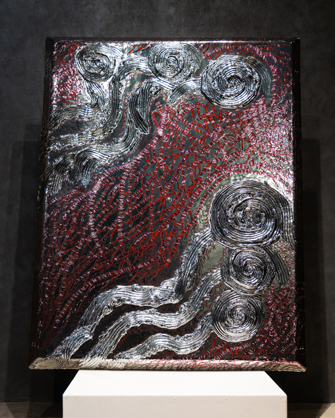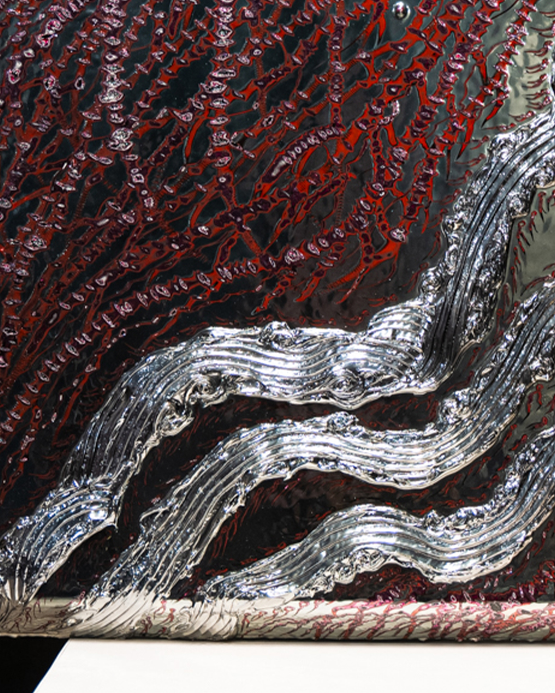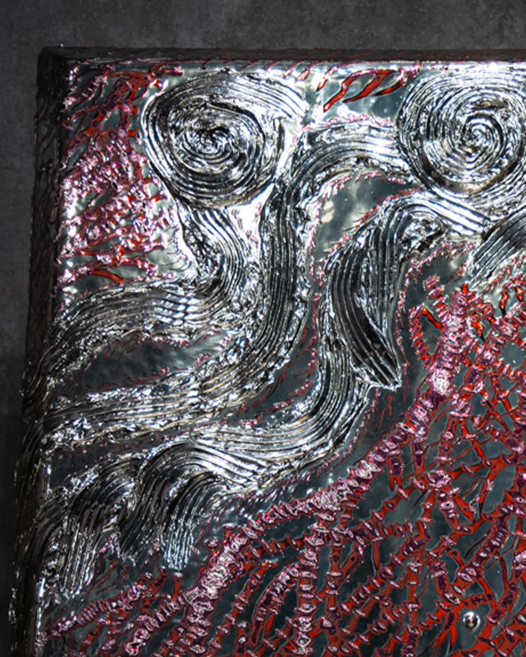 銀龍は東洋において、天や自然界の力を司り、人々の心身の調和や浄化をもたらす守護龍として語られてきました。本作では、銀色の塗料による静かな輝きが、光を受けるたびに柔らかな反射を見せ、静謐で品格ある存在感を放ちます。幾層にも重ねられた表面は繊細な陰影と立体的な造形美を描き、鑑賞者の視線と呼応するように表情を変えます。作品の上下に配された渦巻き状のモチーフは、場を見守る象徴としての静かな力を感じさせ、空間全体に豊かな安らぎと調和をもたらします。F50号というスケールは、エントランスやラウンジ、広いリビングで、静けさと気品ある存在感を示します。