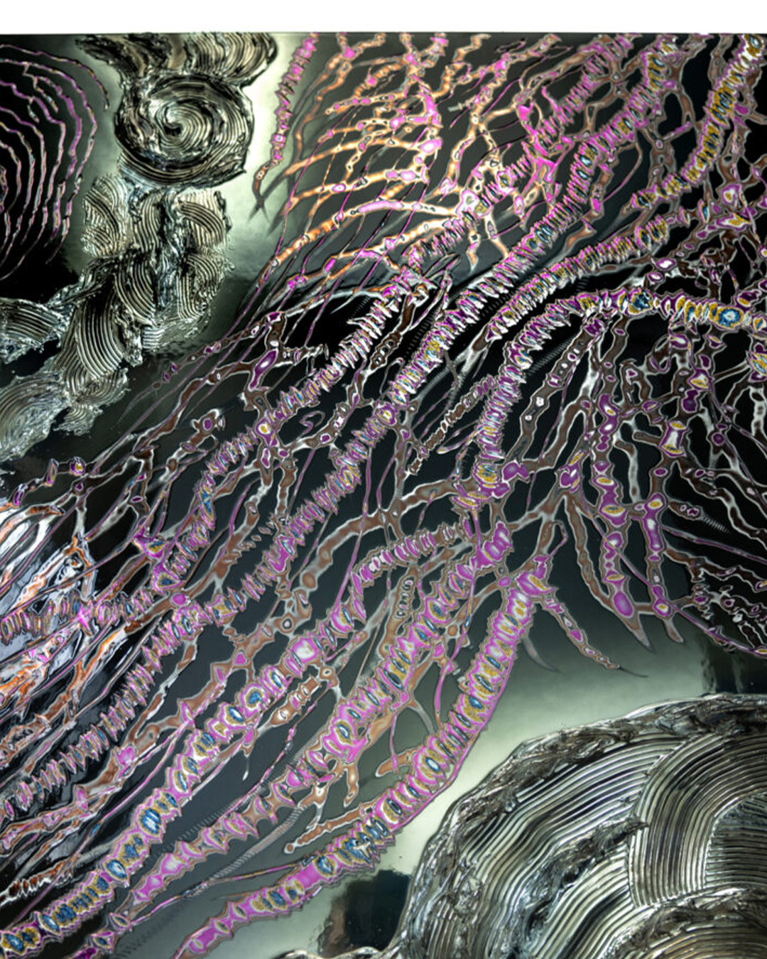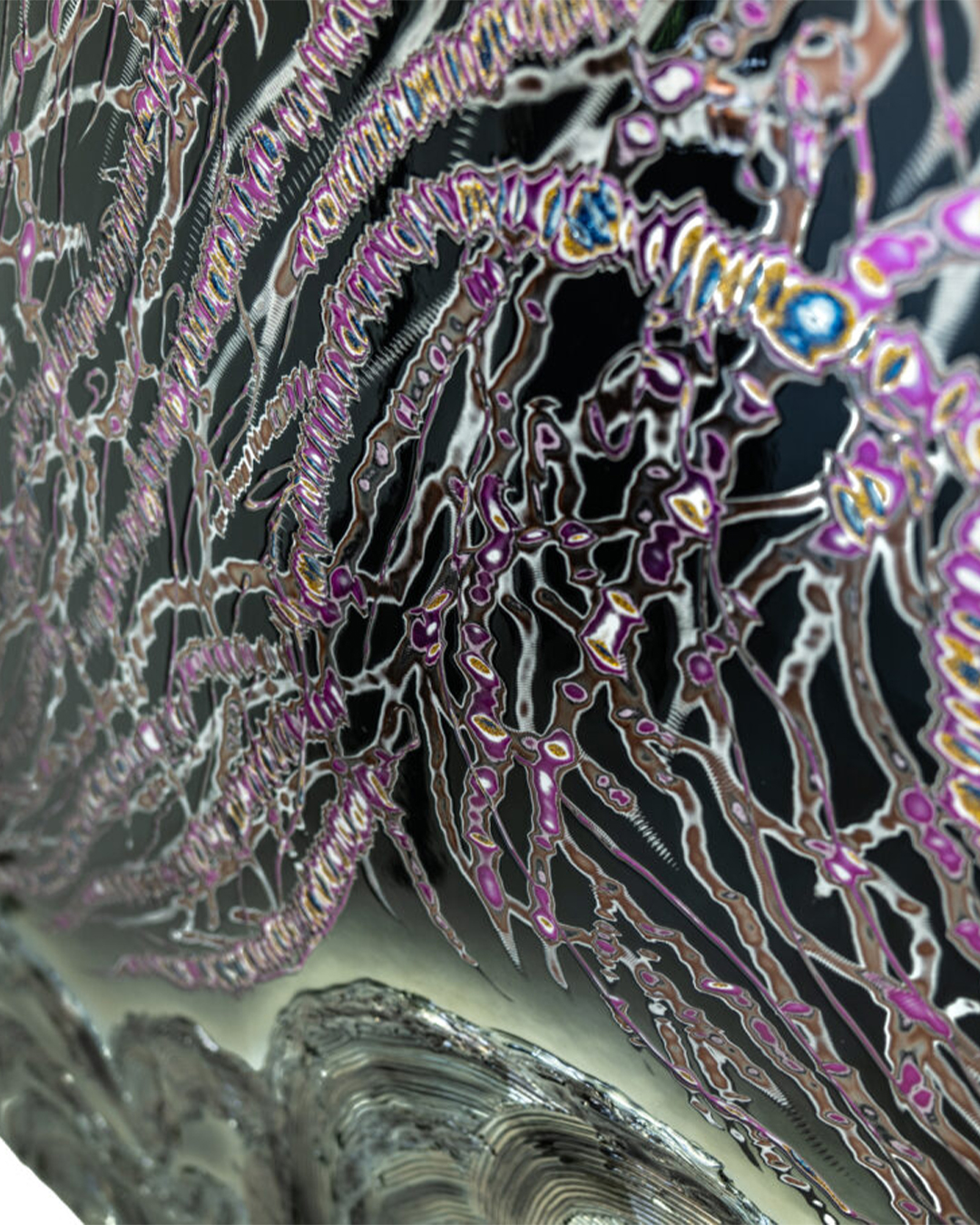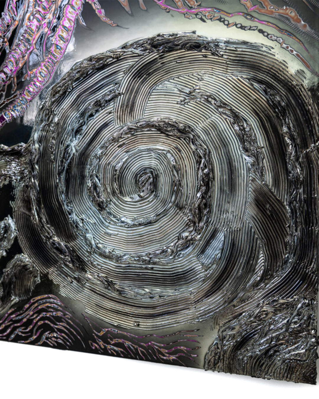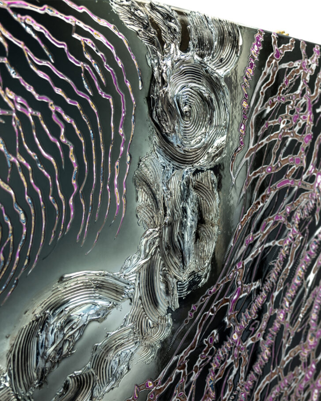The deep black depth of the composition, combined with the tension created by the luminous silver, merges to give the work a profound sense of weight and commanding presence. Capturing a moment as if a black dragon were rising from the depths of darkness, this piece powerfully draws both the viewer’s gaze and awareness when displayed within a space.