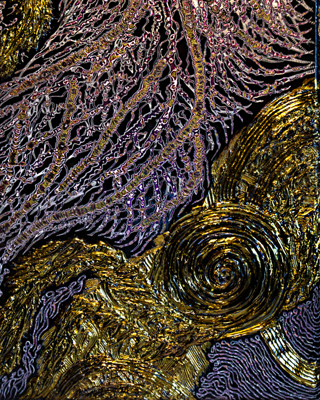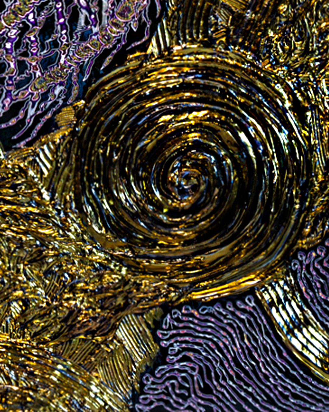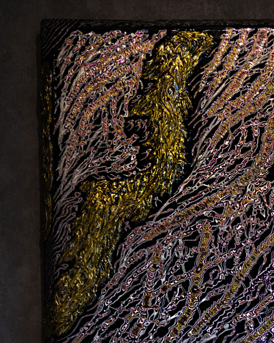 本作の大きな特徴は、24金特殊塗料を用いた贅沢な表現にあります。金の輝きは単なる装飾に留まらず、幾層にも塗り重ね、削り出された線と呼応しながら、作品に奥行きと緊張感を与えています。その工程の積層が、UNDULATIONならではの時間性と精神性を際立たせます。
