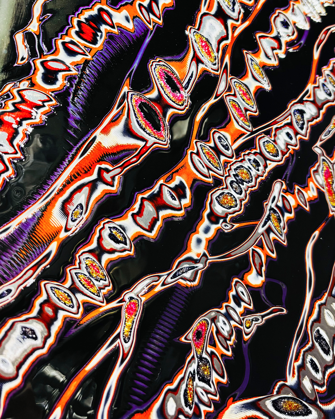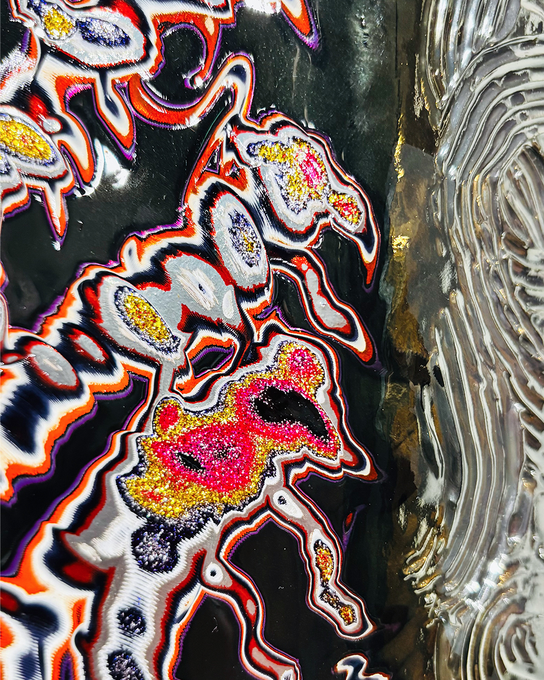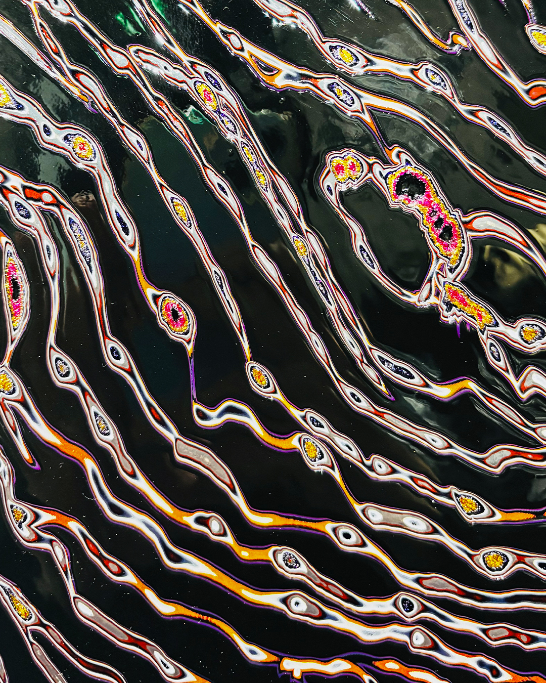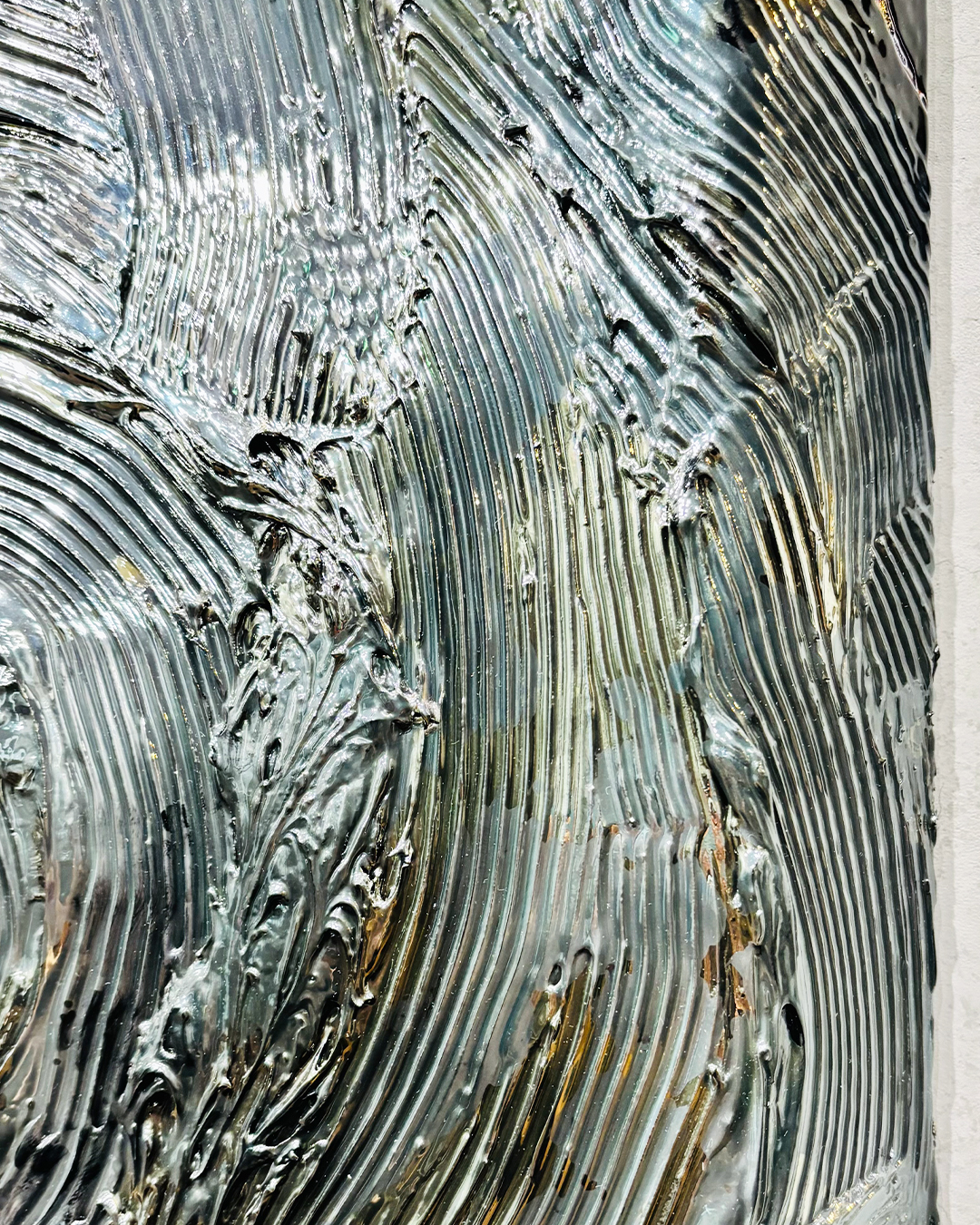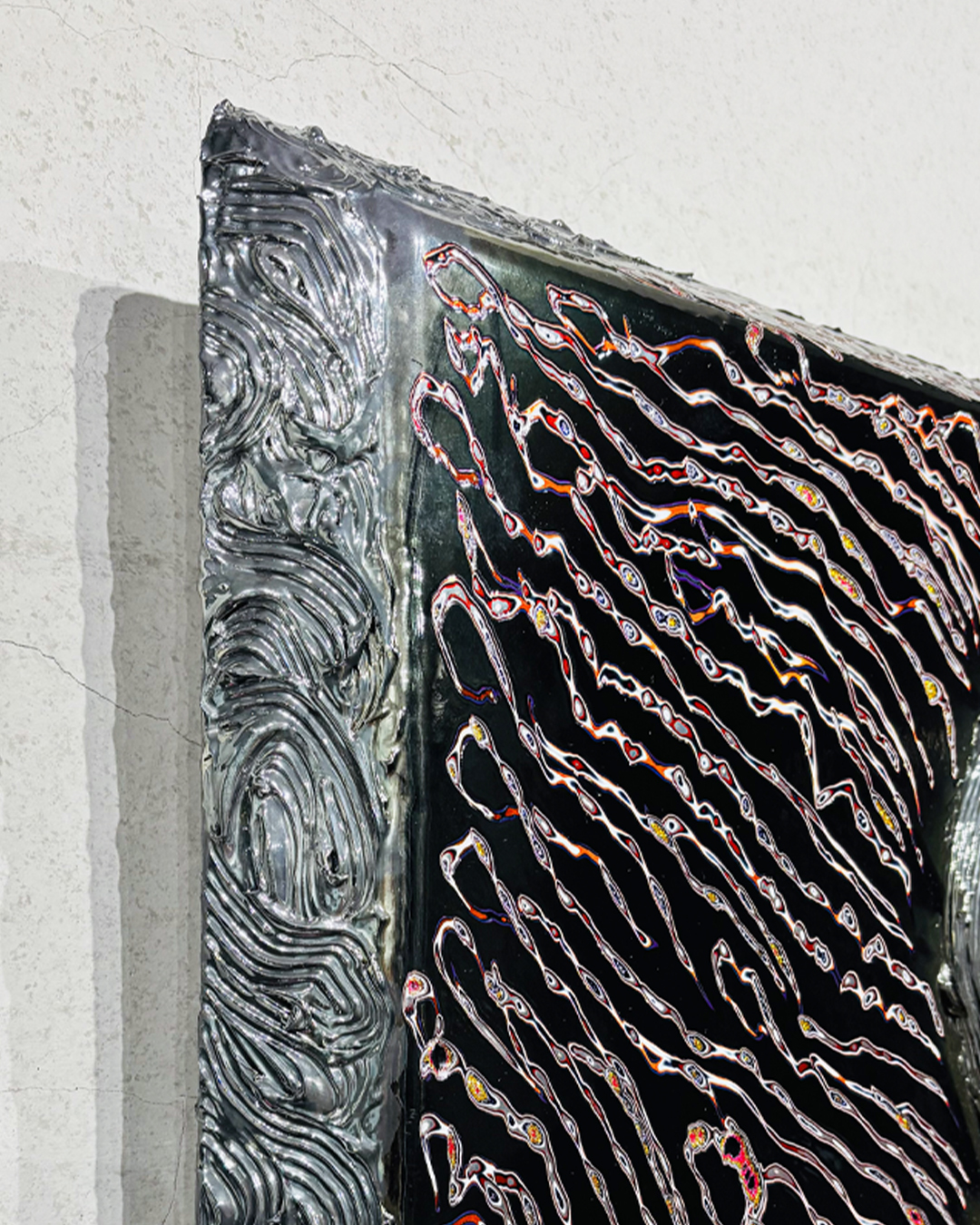 Layers of paint are repeatedly applied to an original FRP canvas and then carefully carved back, a process that creates the undulating forms characteristic of UNDULATION. Through this act of carving, the layers hidden within are brought to the surface, revealing complex shadows and depth as they catch the light. The resulting expression evokes the image of a black dragon quietly stirring in the depths of darkness, as if it is about to reveal itself.