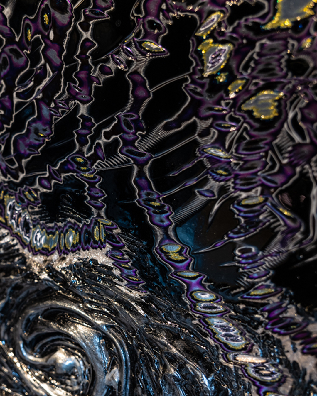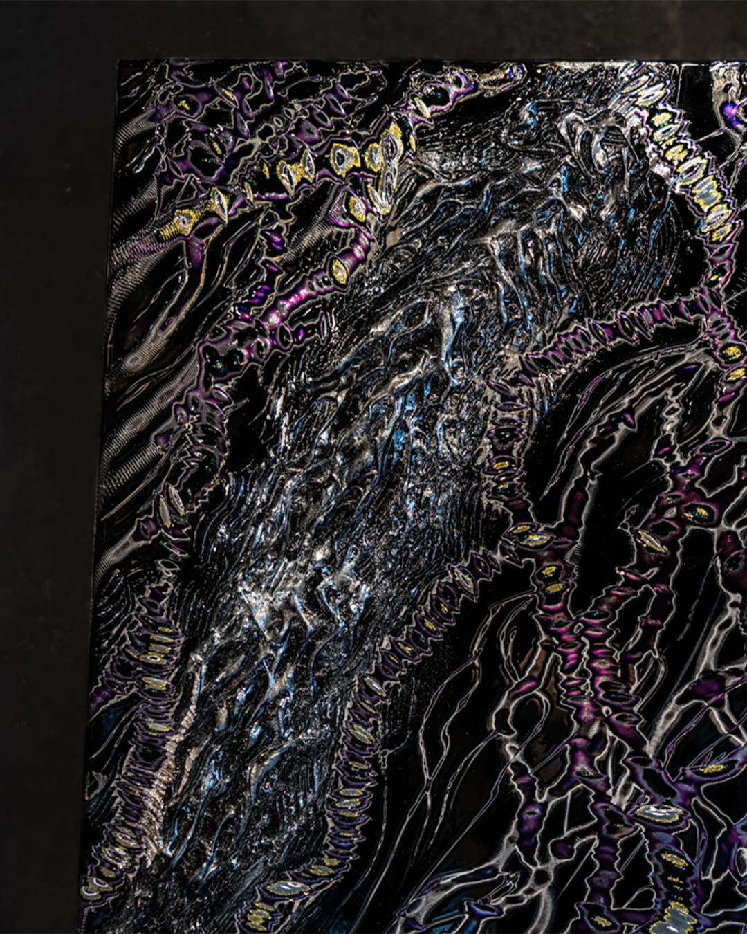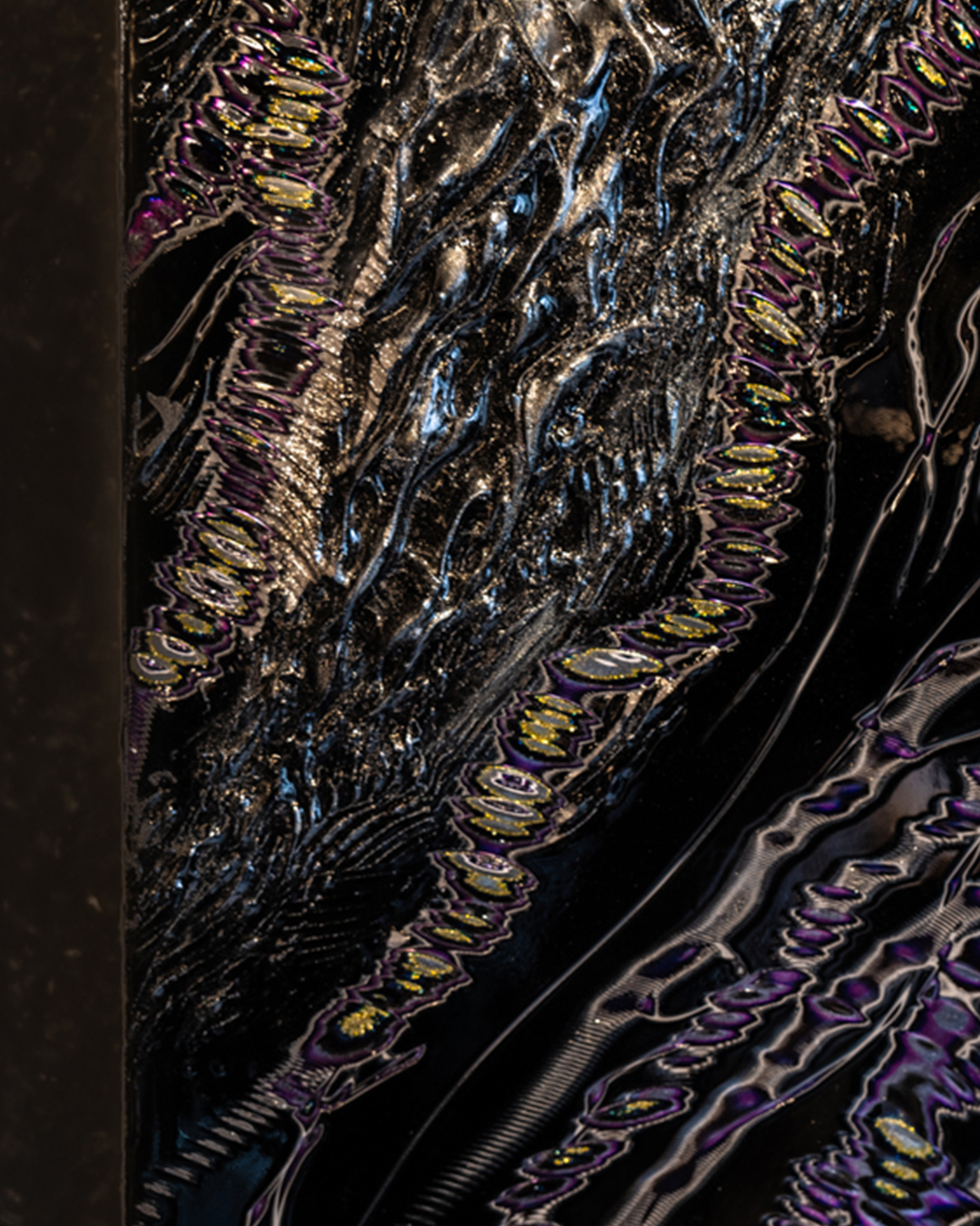 「DRAGON」は、クワイ華の幼少期に刻まれた不思議な記憶や、言葉にしがたいスピリチュアルな体験を背景に生まれた作品です。作品の中を流れるように重なり合う幾多の光の線は、恐れではなく、慈愛に満ちた存在としての龍の姿を象徴しています。漆黒の中に浮かび上がる青紫に輝く光は、まるでフローライトの結晶のように、静かな力と透明感を宿し、見る角度や距離によって表情を変えます。UNDULATION特有の積層表現は、時間や意識の奥行きを生み出し、鑑賞者が自身の記憶や感覚と向き合う時間をもたらします。