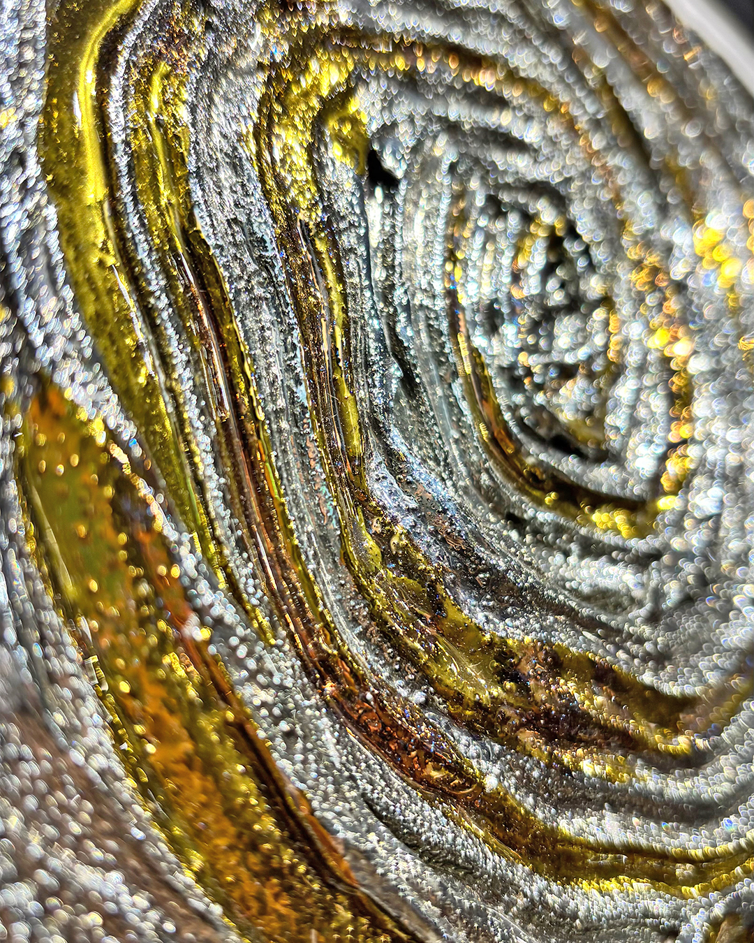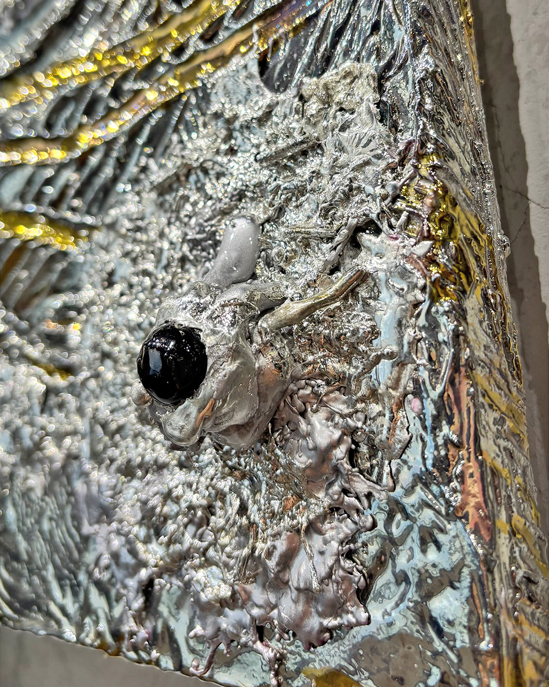 本作《ILLUSION FLOWER / 24K / F8号》は、住空間やホテルの一室になじみやすいF8号(380×455mm)というコンパクトなサイズながら、深い世界観を宿す一点です。作品には、枯山水の流れを思わせる渦巻き模様と、瞬く流星のような繊細な模様が共存し、鑑賞者に銀河を連想させる神秘的な印象を与えます。特に24金特殊塗料が織り成す輝きは、光の角度や鑑賞位置によって変化し、静けさと躍動が同時に立ち上がる質感を生み出します。日常の中の静寂な余白や、特別な時間を演出したい空間において、視線を自然と引き込む存在感を放つ作品です。