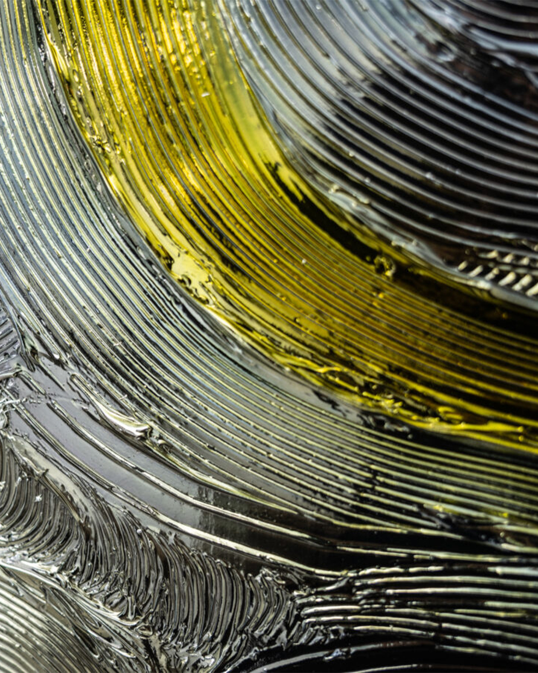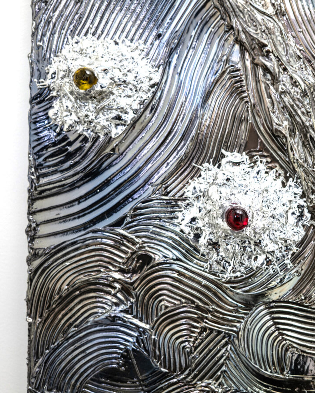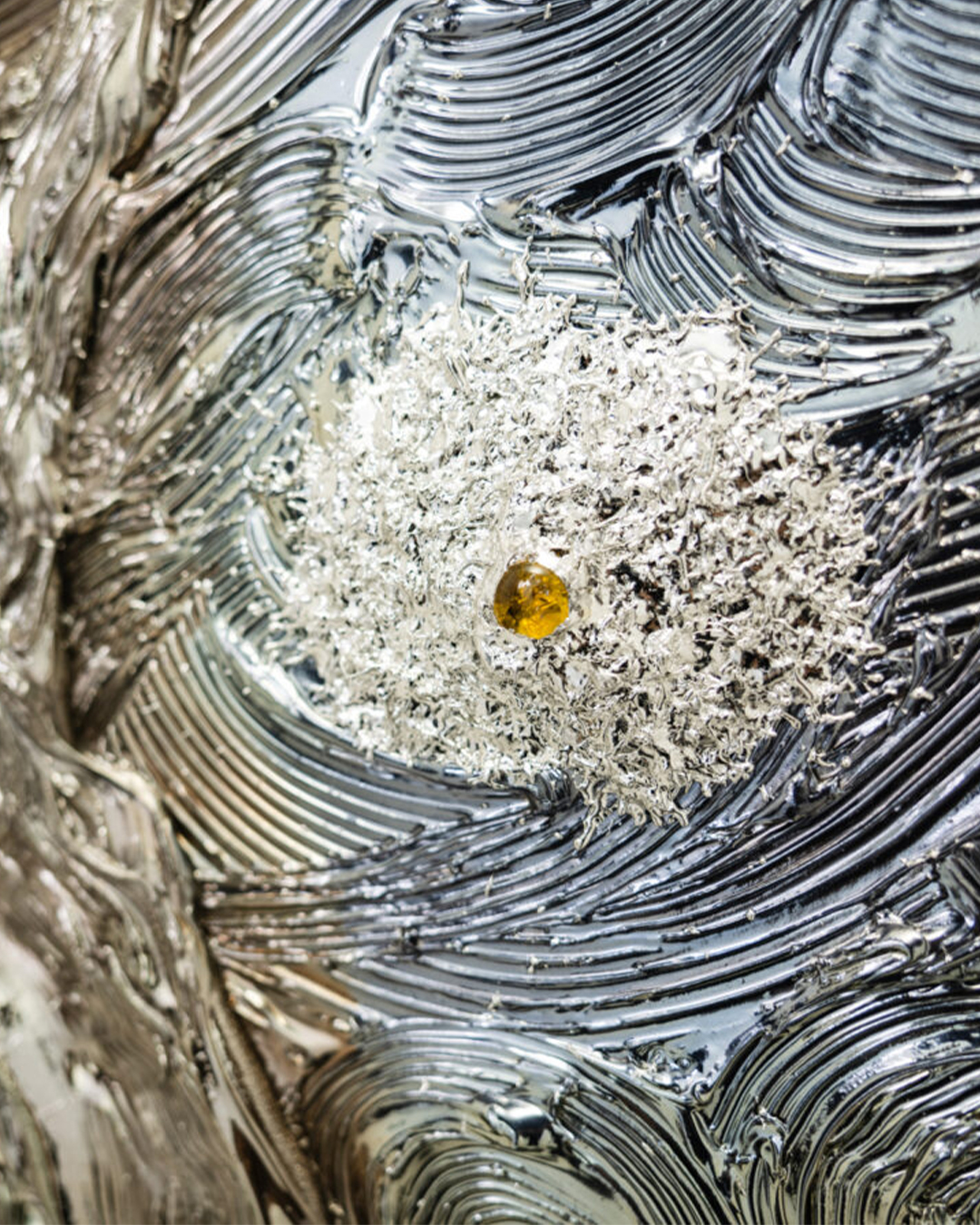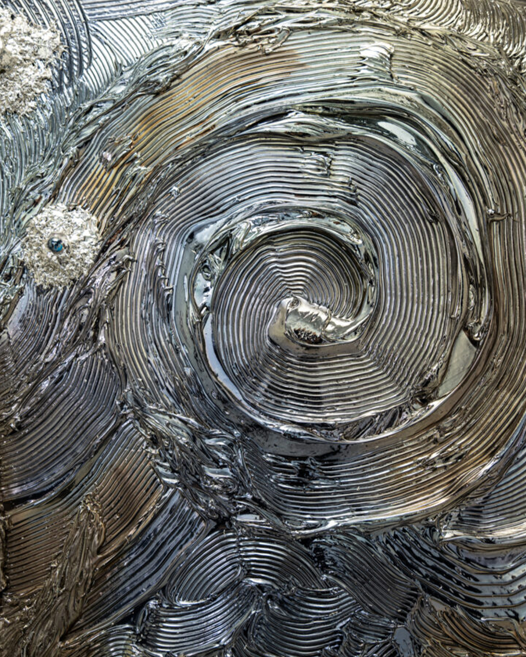 Vincent Van Gogh, whom I deeply admire, has captured my heart since childhood with his masterpiece The Starry Night. Since I started using this special silver chrome paint in my own works, I sometimes didn’t understand why, but I noticed that what was once a full chrome or mirror-like silver coating mysteriously shifted to a blue hue. At first, I was quite confused by this change. Yet, as I gazed into this newly appeared blue color and its profound depth, I could not help but feel that this blue was the very same blue night sky Van Gogh painted in The Starry Night.
