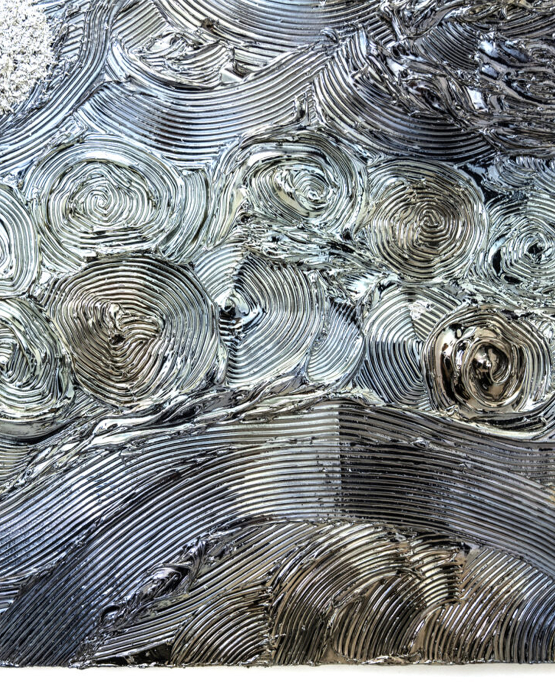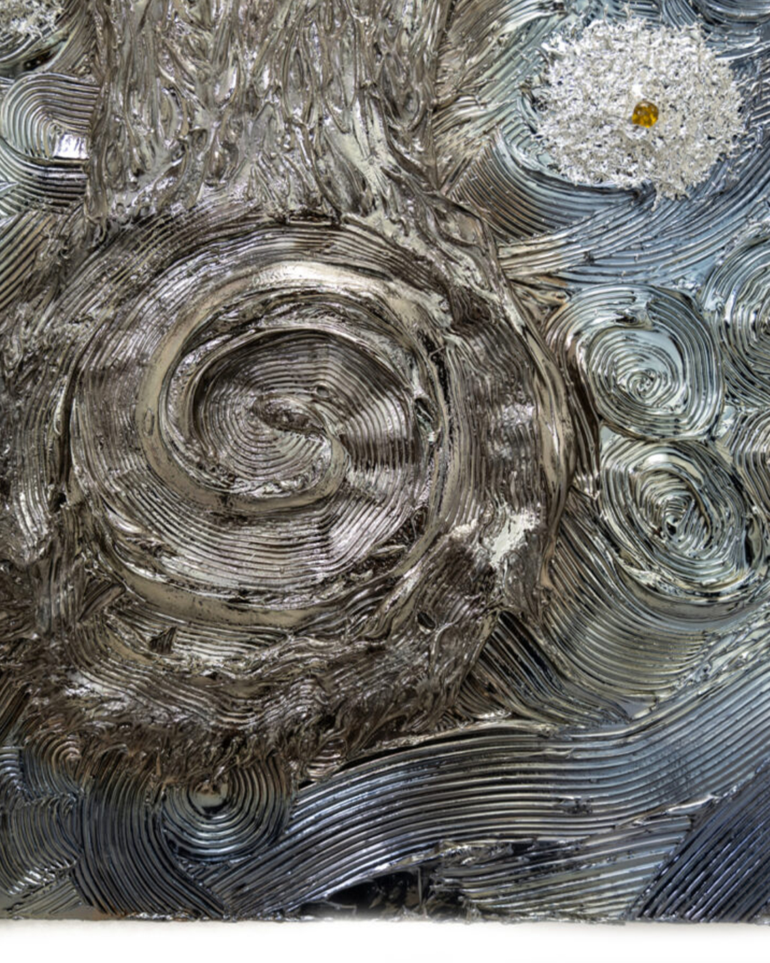 At some point, I learned that this blue hue—suddenly emerging from the silver—was actually the blue wavelength within the visible spectrum, and I understood the reason behind this transformation. From then on, I felt compelled to express Van Gogh’s The Starry Night using this unique method and approach that I had come to know. In late April 2024, I was finally given the opportunity to consolidate all my ideas into a single work. Of course, everything is made with heartfelt respect and homage to Van Gogh.