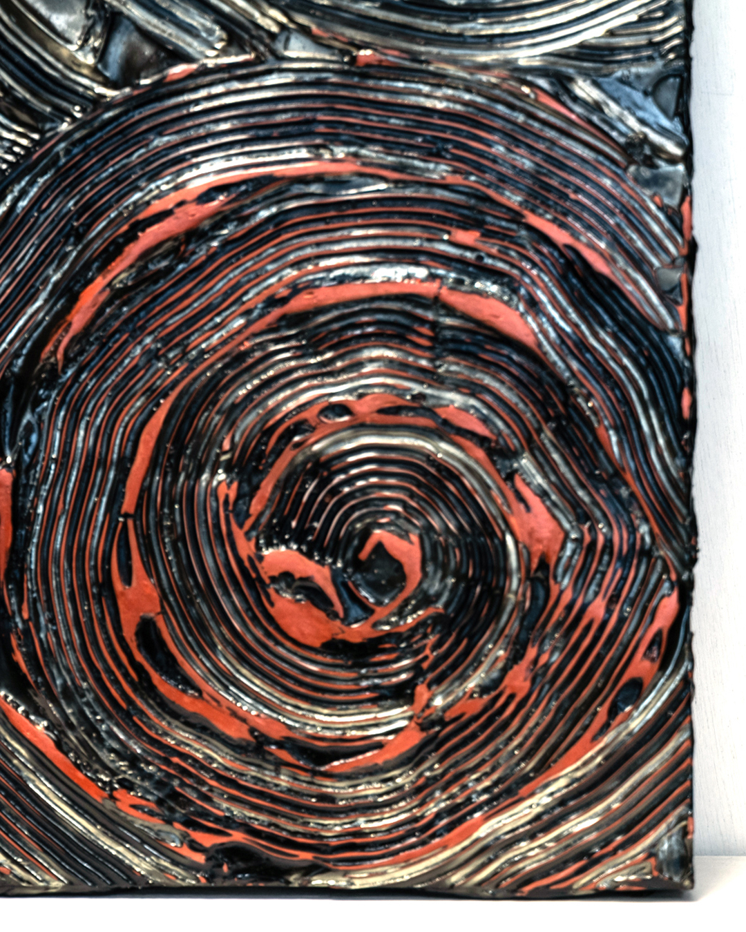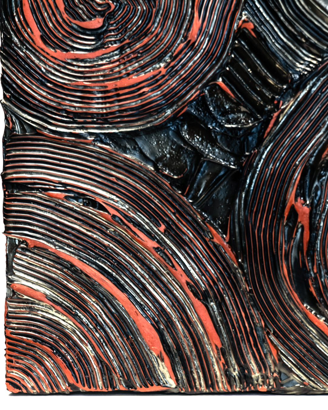 渦巻く幾何学的なパターンにファイアーレッドの色彩がまとわりつき、光の角度によってその色は燃え上がったり、消えかかったりと、まるで揺らめく炎のような表情を見せます。
