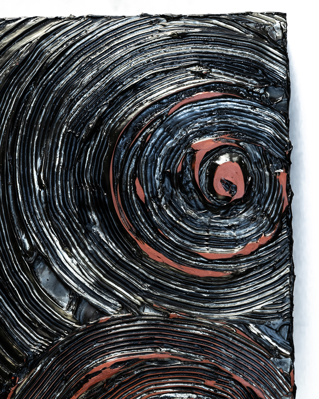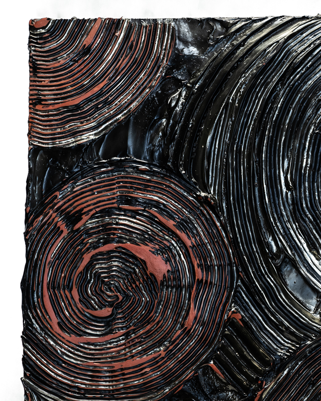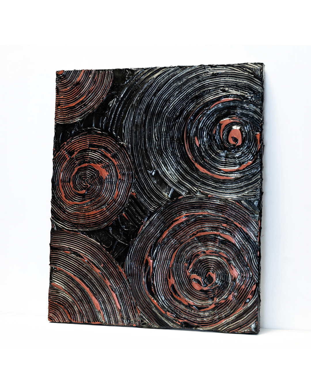 The spiraling geometric patterns are wrapped in fire-red hues that, depending on the angle of light, appear to flare up or fade away, creating the flickering expression of a living flame. The forms, delicately extending from the center to the periphery, evoke a sense of stillness and harmony, while imparting an impression of inner passion and strength to the viewer. Placed in a study, living room, or other serene space, the work brings a dynamic yet refined resonance to everyday life.