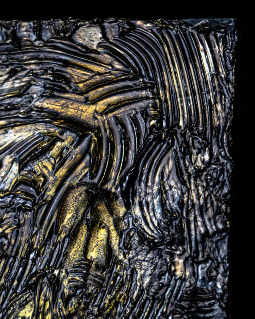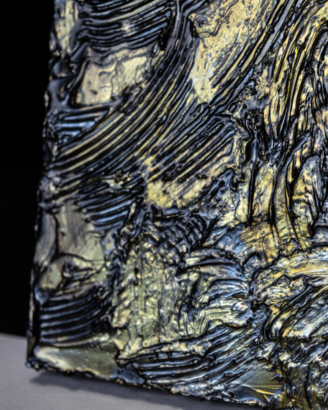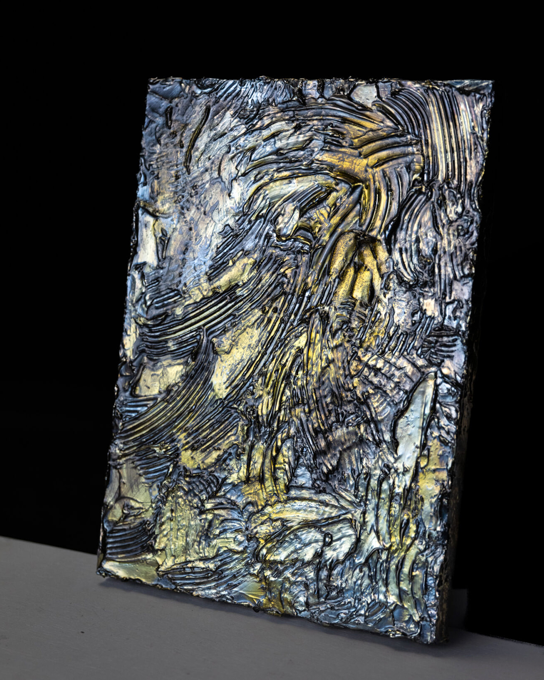 Sprayed with specially formulated industrial coatings, then fired and hardened, the resulting ridges evoke the cross-section of geological strata. The metallic light, infused with silver pigment, shifts subtly with the viewing angle at times revealing cool bluish tones, at others a muted golden hue. The surface texture feels as though it might begin to move again at any touch.