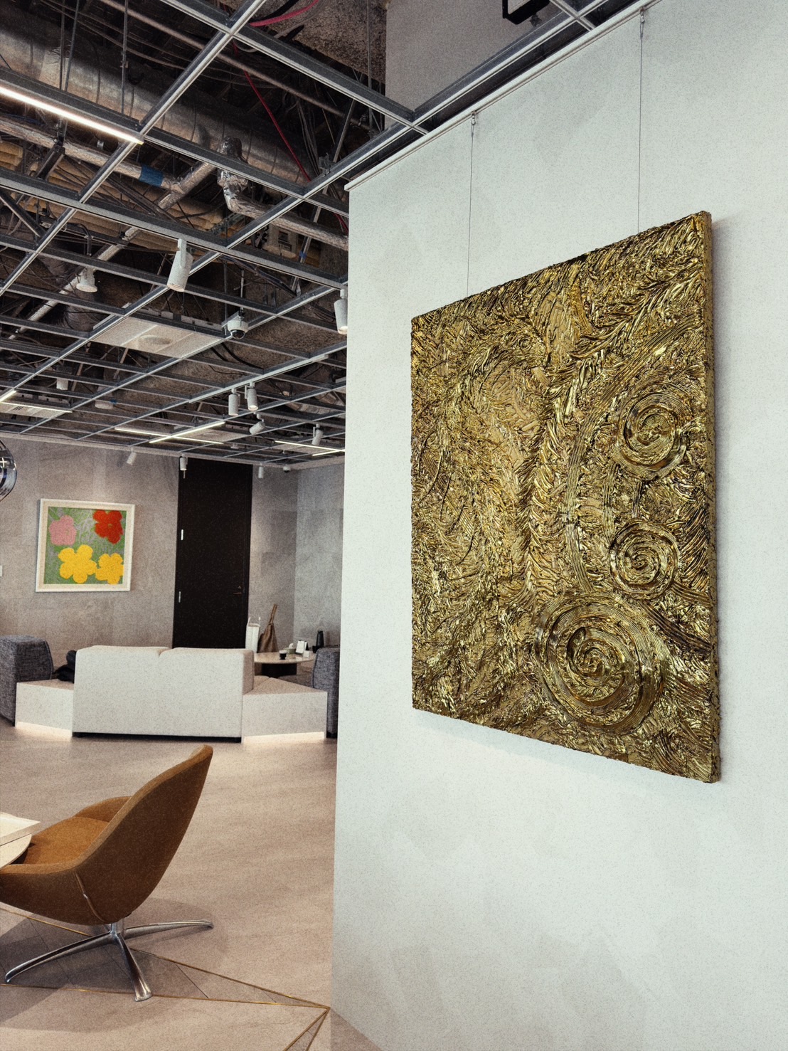 キャンバスに施された24金ベースの特殊ペイントは、まるで内側から光を放つ生命のように輝きます。その金の煌めきは、時間とともに柔らかく変化し、日差しの強さや角度によって異なる物語を紡ぎ出します。幾層にも重ねられた素材と塗装が、光と影の間で微かなさざめきを生み、作品に静かで力強い物語性をもたらしています。