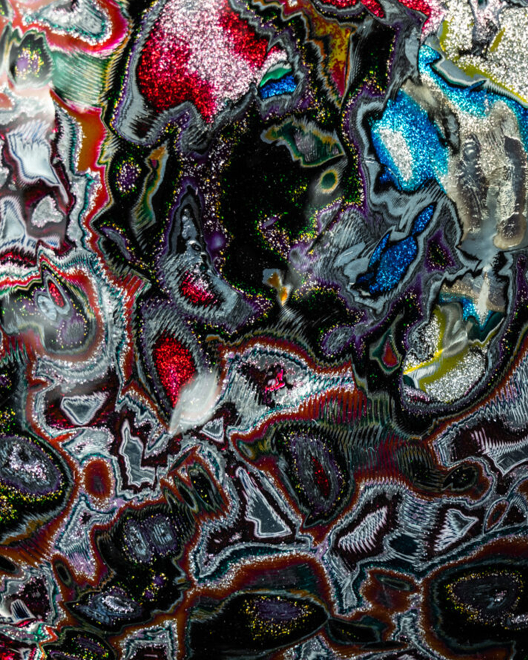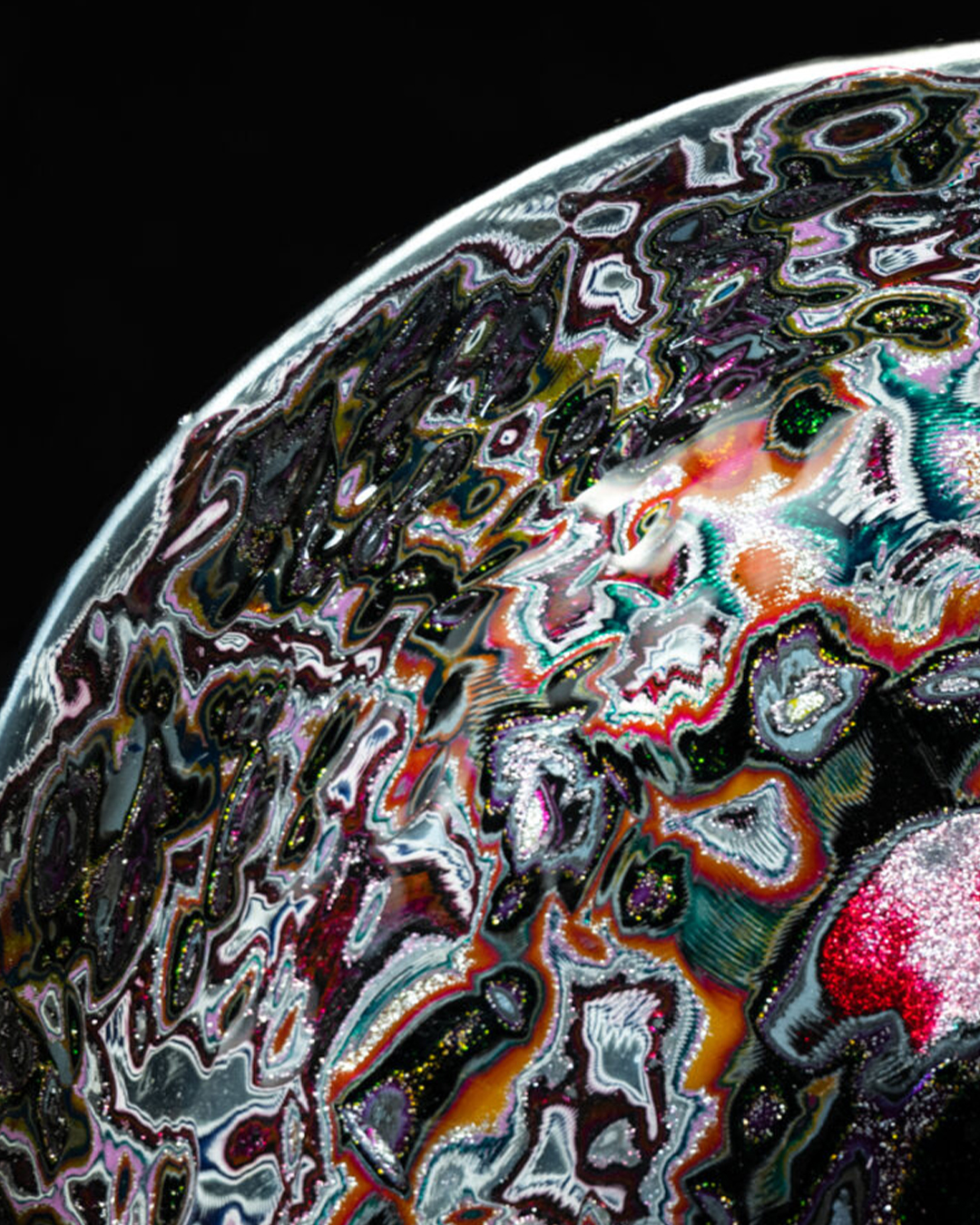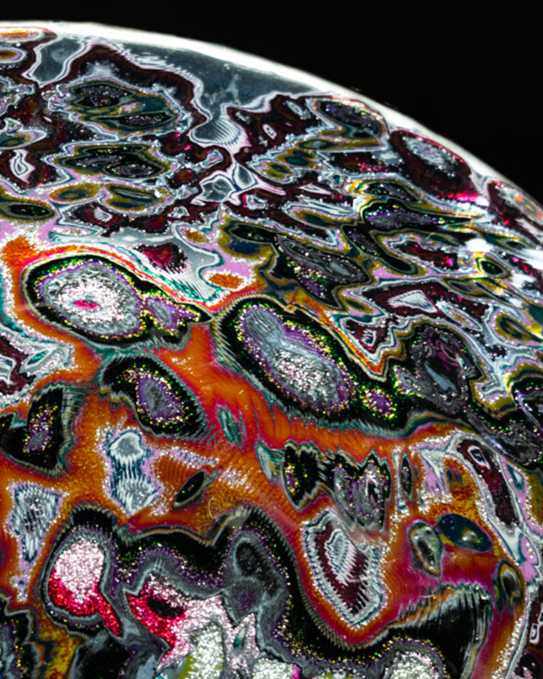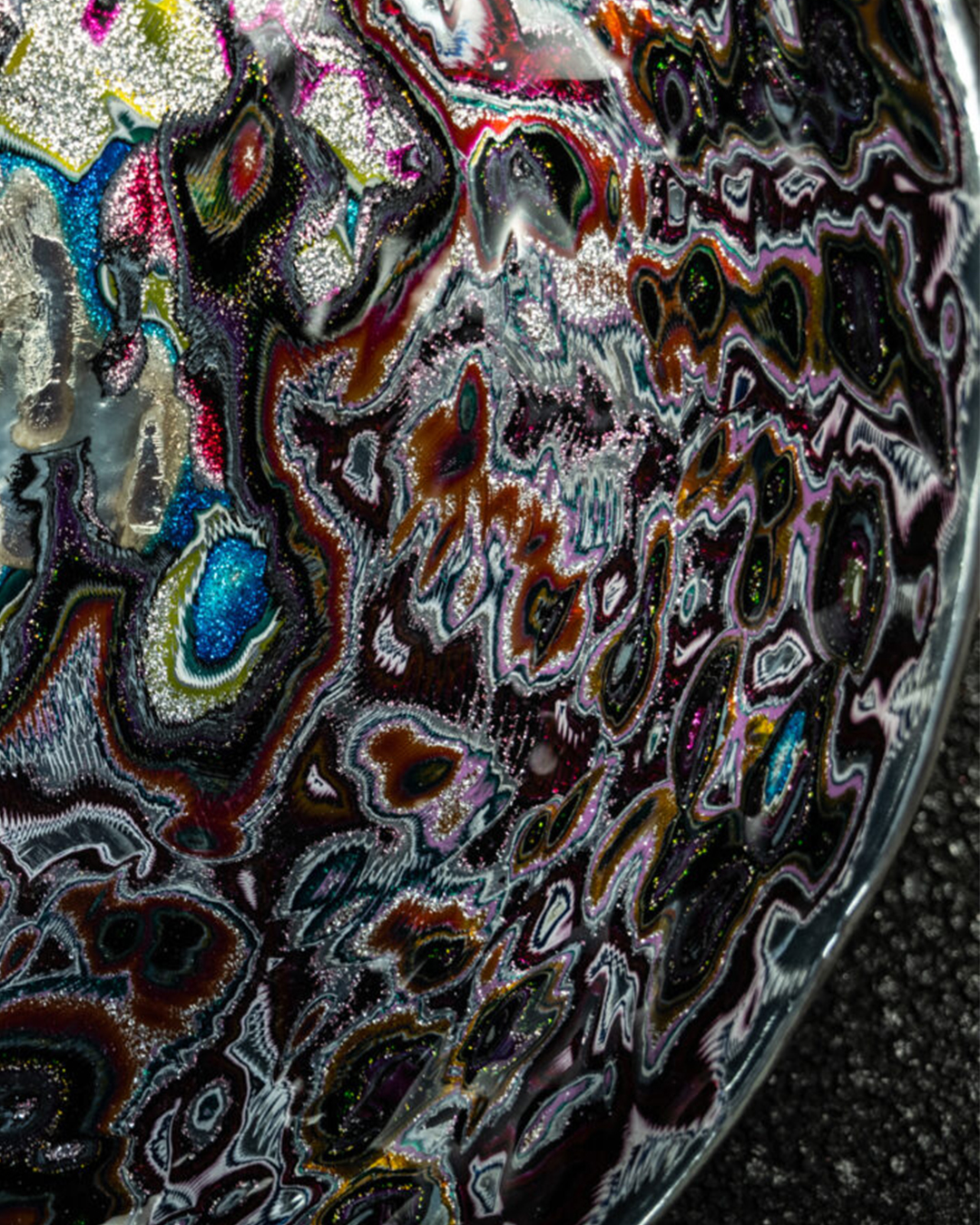 This work is a large round plate created as a viewing object by UNDULATION by Kuwai Hana. Through the repeated layering of special paints, followed by firing and grinding processes, the surface acquires a sense of depth and distinctive shadows formed by multiple strata.