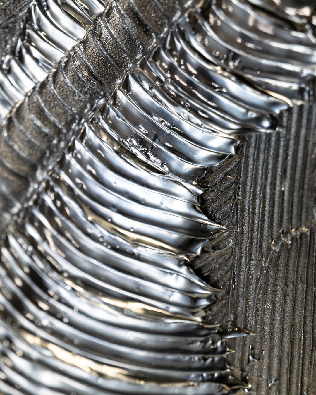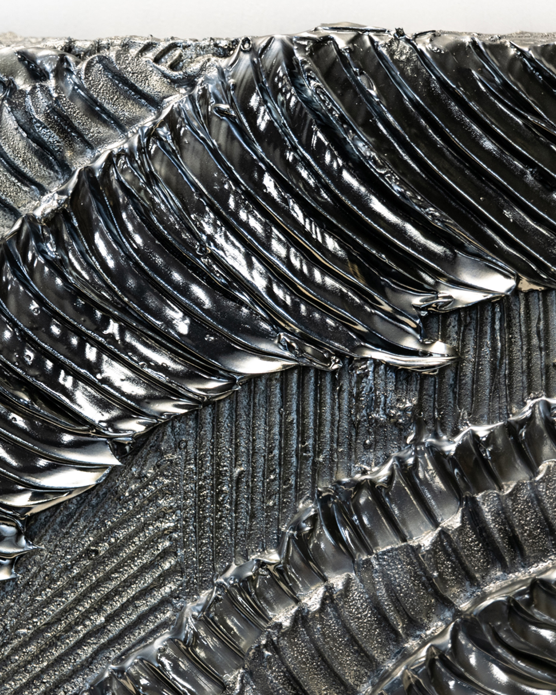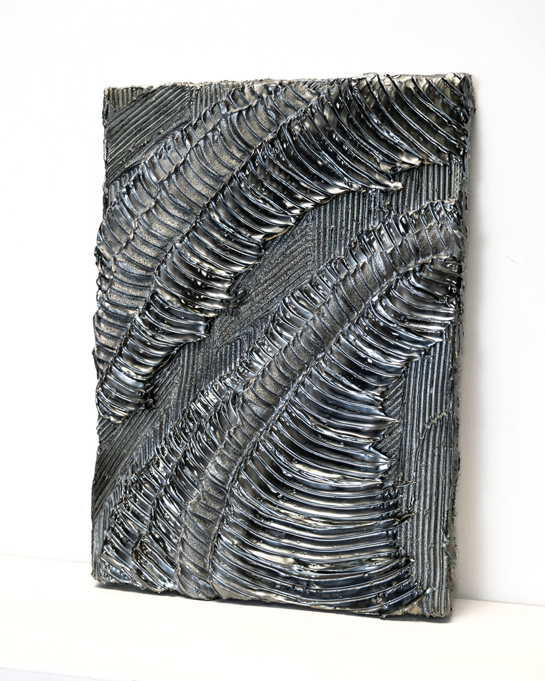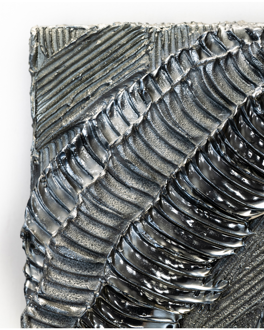 同じ銀色でありながら、マットと光沢といった異なる質感が織り交ぜられることで、表情に豊かな奥行きが生まれています。光の当たり方によって浮かび上がる微細な差異は、素材そのものの魅力を際立たせています。F4号というサイズ感は、書斎やベッドサイド、静かな壁面に適しており、日常の中でそっと寄り添いながら、空間に緊張感と品格を添える作品です。
