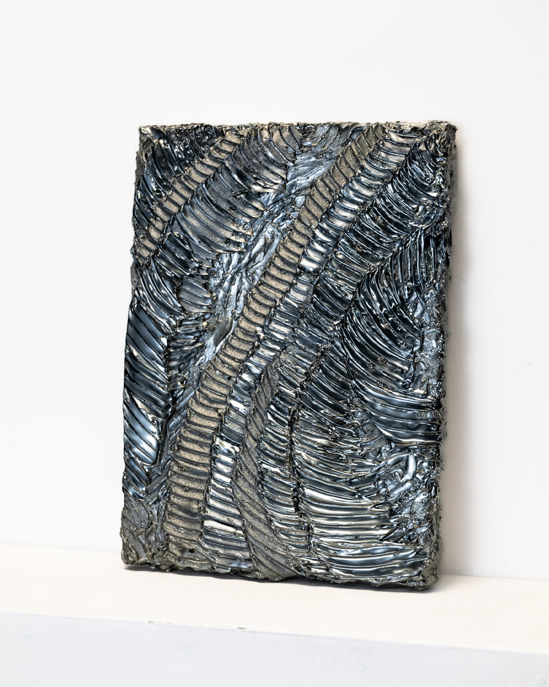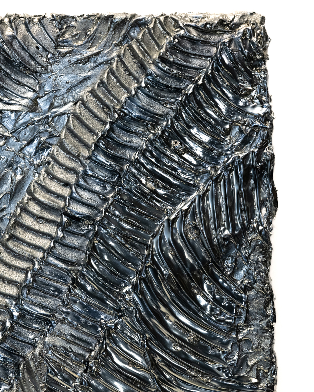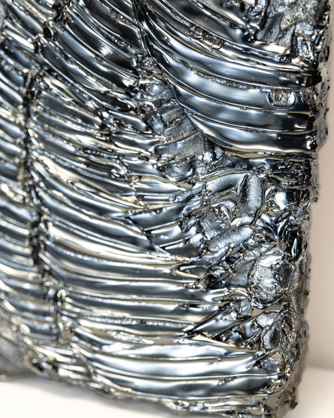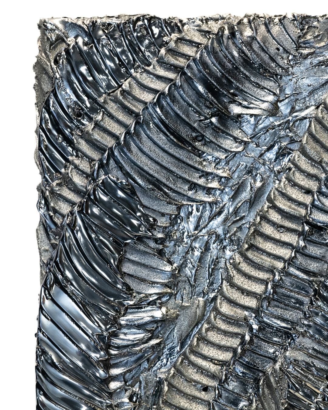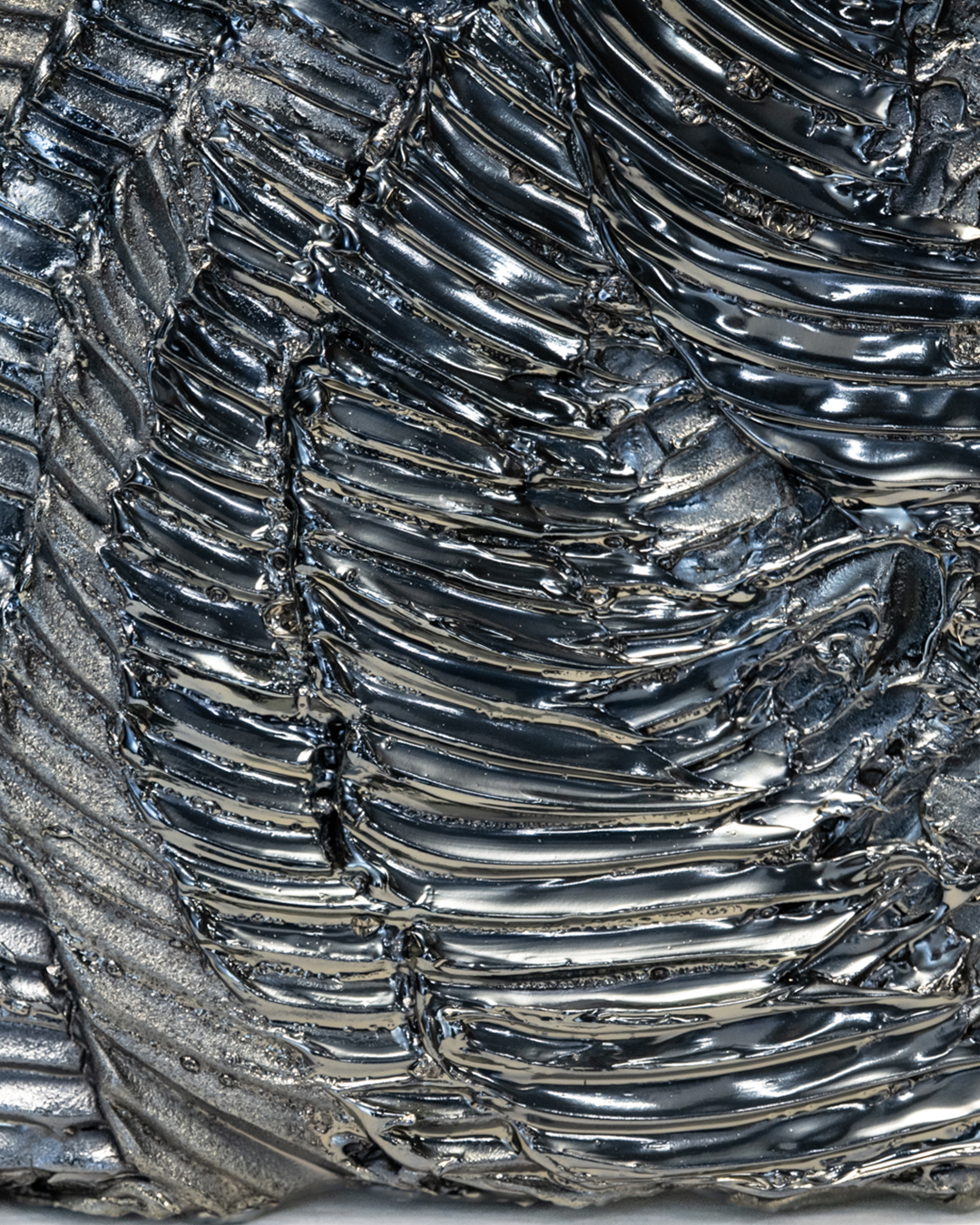 本作《WAVE》は、シリーズの中でも特に、光によって表情を変えるシルバーの揺らぎが印象的な一作です。使用しているのはあくまでシルバーの塗料のみであり、青の塗料は一切用いられていません。しかし、光の角度や鑑賞距離によって、銀色が青を帯びて立ち上がるように見える現象が生まれ、可視光の作用そのものが作品の一部として表現されています。