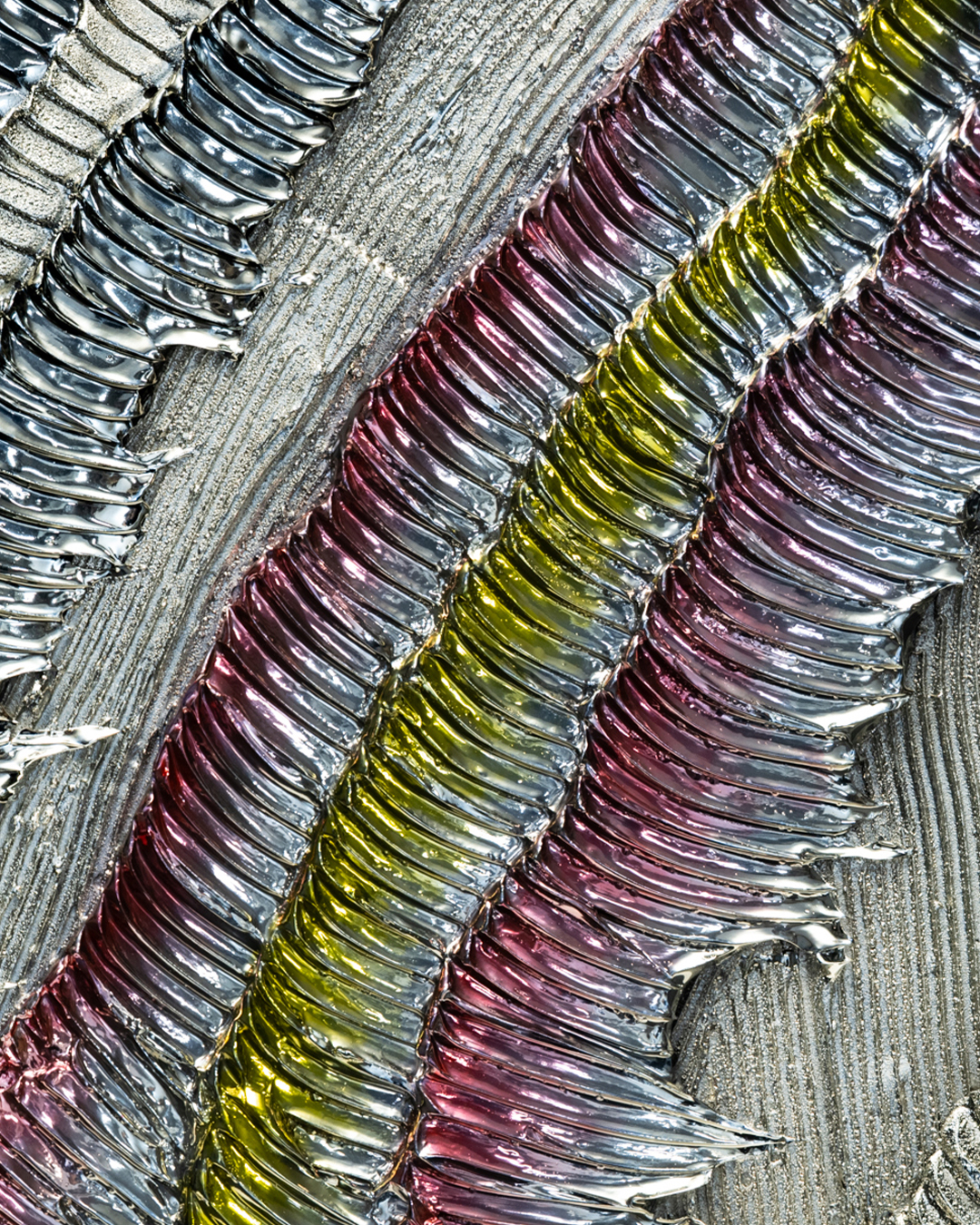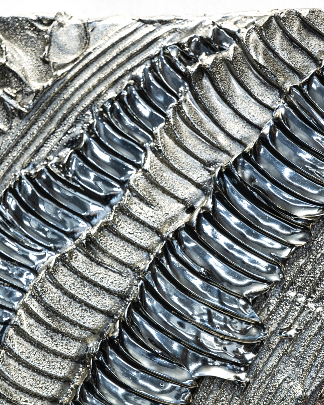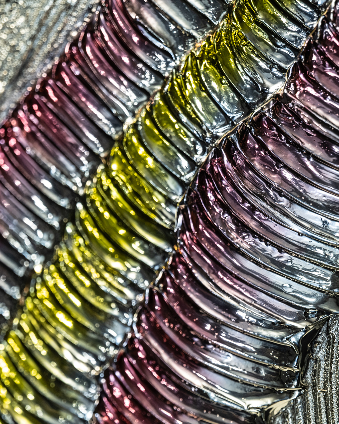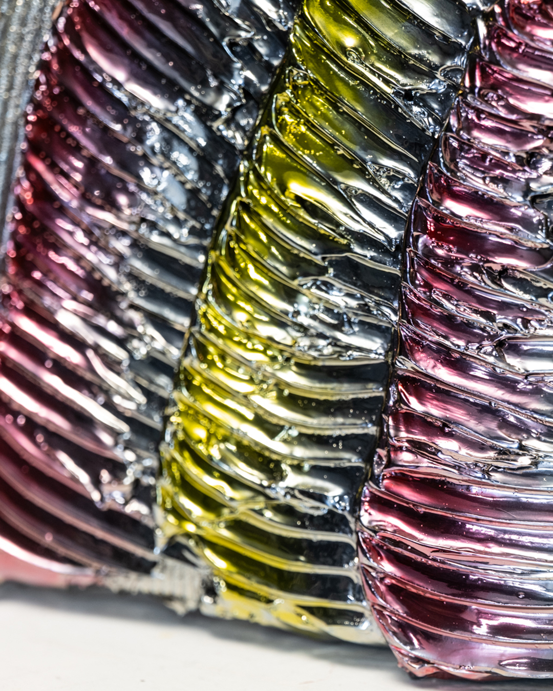 本作は、WAVEシリーズの一作で、スペイン国旗を象徴する赤とグアルダ黄色の色彩を大胆に取り入れています。躍動する波のような造形に、鮮やかな赤と温かみのあるグアルダ黄色が交錯し、光の角度や鑑賞位置によって表情を変える動的なビジュアルを生み出します。